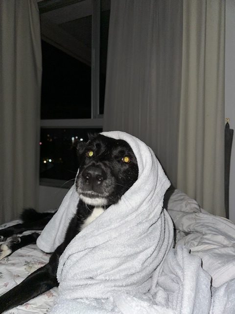 Wir liegen mittlerweile entspannt zu dritt im Bett, ich zeige ihm die Welt beim Schnüffeln und bringe ihm bei, dass man große Hunde besser nicht angreift, wenn man ein langes Leben haben möchte.