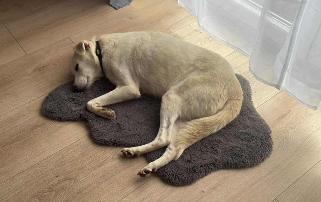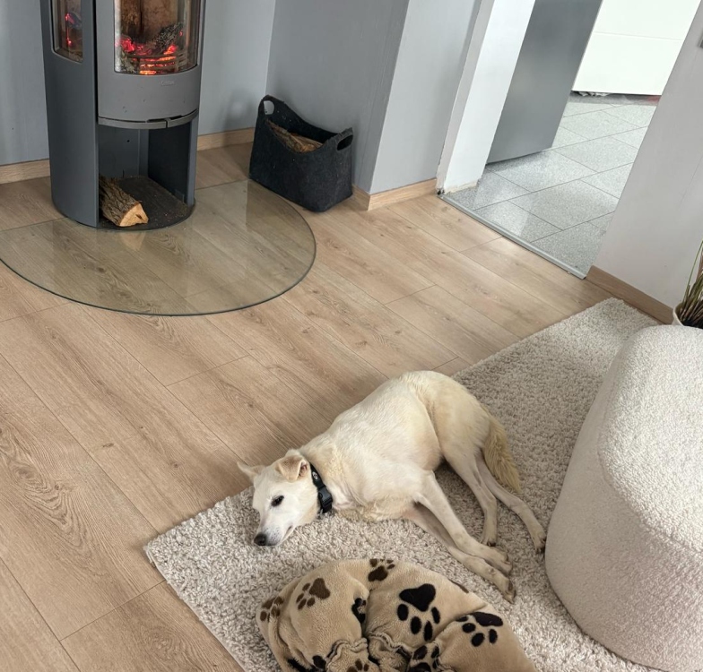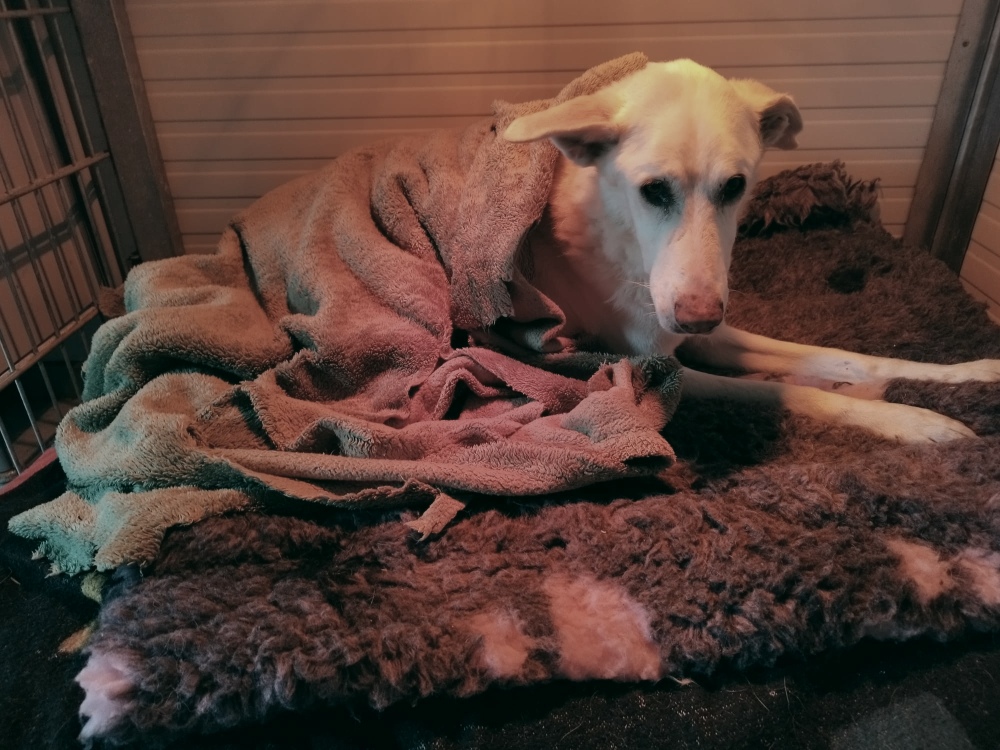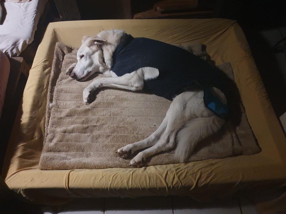 Dass er nicht in seiner gewohnten Umgebung war hat ihn unheimlich aufgeregt und er hat dann auch später im Haus geraume Zeit gebraucht sich wieder zu beruhigen. Gefuttert hat er gut und jetzt schäft er entspannt. Mal sehen wie das weitergeht, denn bisher weigert er sich zu laufen. Er hat eine große OP Narbe am Bauch und dass scheint sich in seinem Kopf zu manifestieren, dass damit die Beine nicht mehr zu gebrauchen sind. Tragen ist durch die Wunde aber auch nicht wirklich praktikabel. Na ja, wir werden es wie immer irgendwie hinbekommen.