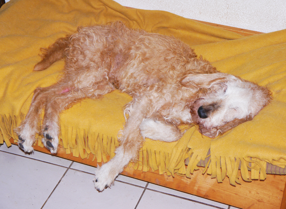 Die Hündin war gechipt und registriert, aber die Telefonnummern stimmten nicht mehr. Da die Besitzerin ihren entlaufenen Hund bei der Polizei meldete, fand sie letztlich zu uns. Wir waren über den Zustand der Hündin völlig entsetzt und wollten der Frau den Hund nicht heraus geben. In einem intensiven Gespräch ließ sich der Sachverhalt klären. Die Kleine war durch eine Klinik mehrere Male nicht abgesprochenen OPs unterzogen worden. Zuletzt vor über einem Jahr wurde der Fixateur gesetzt, da sie so dünne und schwache Knochen habe. Von einer Entfernung des Fixateurs war nie gesprochen worden! Die Hundefriseurin traute sich nicht in der Nähe des Fixateurs etwas zu machen, daher der ungepflegte Zustand des Fells.