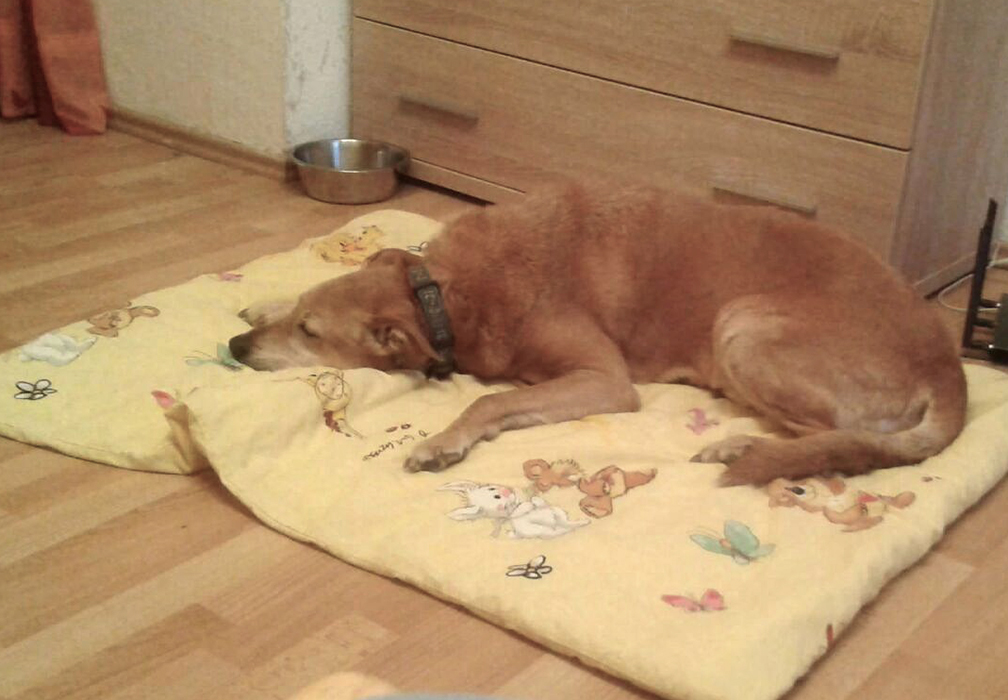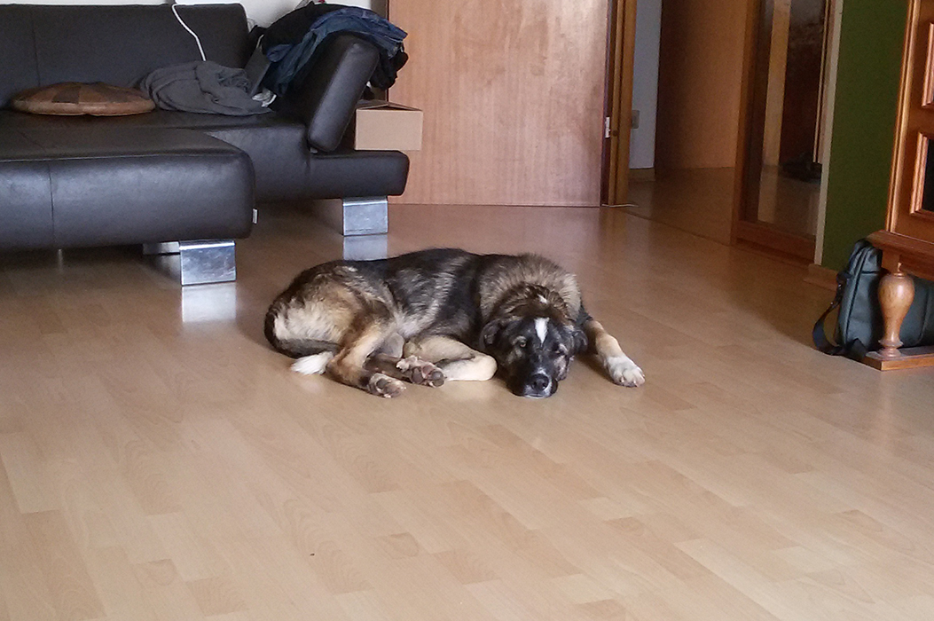 Dafür war ich umso erstaunter, dass Pinto problemlos in den Aufzug ging, Treppenstufen lief und ganz unbefangen die Wohnung betrat. Seine neue Kumpeline Mia, eine Leonbergerhündin hat Pinto erstmal die Hausordnung erklärt und nachdem er sich alles angeschaut hatte, fielen ihm vor Erschöpfung die Augen zu.