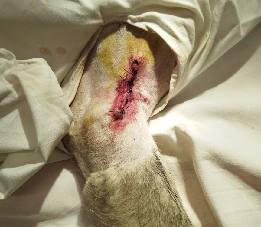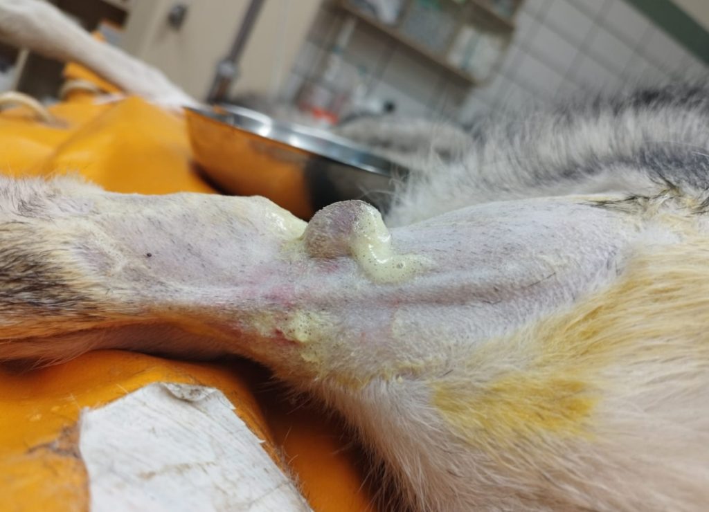 Unser Daueraufenthaltsort derzeit, Tierarztpraxis. Heute wurde bei Scooby ein Tumor im voderen Bereich des rechten Ellenbogens entfernt. Zum Glück war das Ding klar und gut abgegrenzt so dass es vollständig entfernt werden konnte ohne viel tiefer schneiden zu müssen. Die Stelle ist zum heilen ungünstig da immer viel Bewegung drin in ist. Aber Scooby ist jetzt in der Quarantäne und wird bis zum Fäden ziehen viel Ruhe halten (müssen). Der Tumor wurde eingeschickt, mal sehen was der pathologische Befund ergibt…