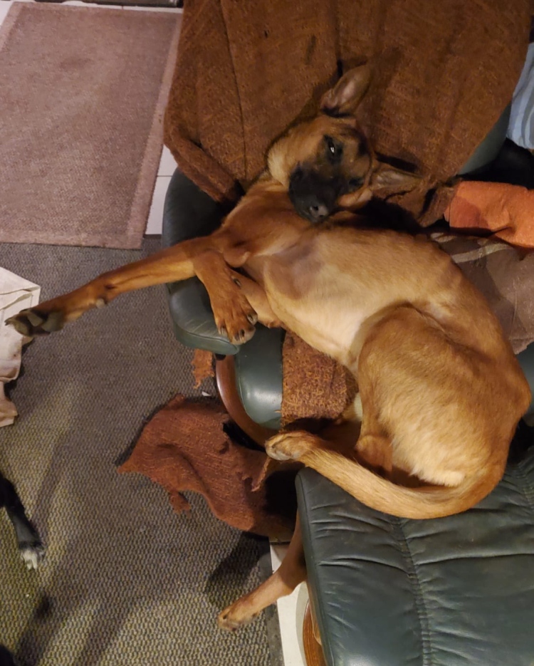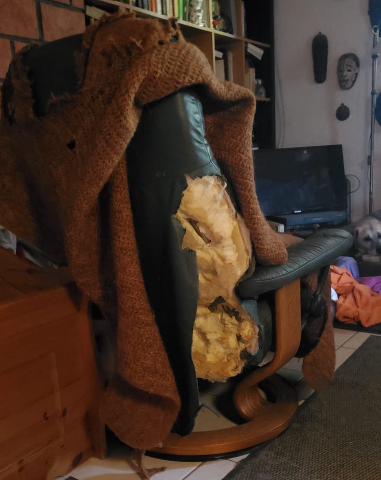 Mit uns im Haus leben nicht nur die Alten und Kranken sondern auch eine ganze Reihe junge/jüngere Hunde die keine Chance auf eine Vermittlung haben wenn sie nicht vorher das Zusammenleben mit Menschen in häuslicher Umgebung lernen können. Der Preis dafür ist manchmal hoch… Maka stellte unsere Geduld eine ganze Weile auf eine ziemlich harte Probe. Zerkaute Kabel/Ladekabel, himmelte den Fernseher, „las“ dutzende von Büchern und, und, und… Auch wenn der den Stress-less-Sessel von hinten derbe unter ihm gelitten hat, die Wolldecke nur noch in Fetzen erhalten ist, er liebt ihn heiß und innig und es ist sein Lieblings Schlafplatz, wahrscheinlich ist das auch der Grund warum die Vorderseite unbeschädigt geblieben ist. Inzwischen hat sich seine Neugier alles mit dem Maul und den Zähnen zu erforschen ziemlich gelegt, das lässt doch hoffen, dass aus Maka noch mal ein angenehmer Mitbewohner wird. Man wird so bescheiden mit den Jahren…