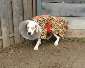 Unser lieber Lenny war auch heute noch nach der großen OP von gestern, noch sehr verhalten und ruhig, was richtig komisch ist, da Lenny normalerweise gerne und viel erzählt. Er ruht sich aus und schläft unter den Wärmelampen, was ja auch gut ist. Eigentlich tragen unsere Hunde ja Thornis als Leckschutz, bei Lenny ist es aber wichtig, dass er sich nicht mit den Pfoten an den Augen reibt, da sonst die Nähte aufgehen könnten und das sollte auf keinen Fall passieren. Wir haben ihm einen kleinen Plastikkragen angepasst, der ihn nicht so behindert aber für einen blinden Hund, ist es auf jeden Fall eine ganz blöde Sache, so etwas tragen zu müssen.